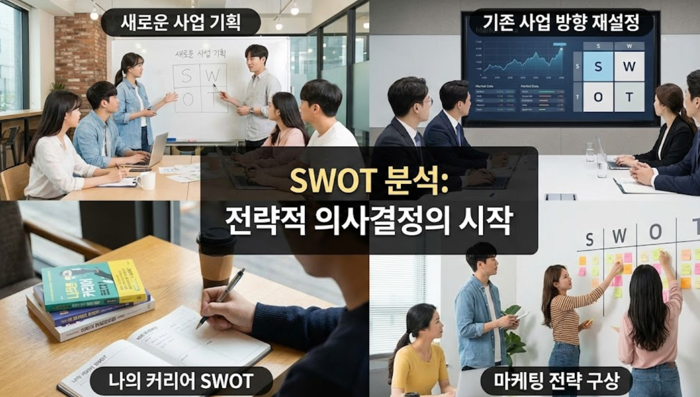 새로운 사업을 시작할 때, 기존 사업의 방향을 재설정할 때, 개인의 커리어 계획을 세울 때, 마케팅 전략을 구상할 때 등 어떤 결정을 내리기 전에 현재 상황을 명확히 이해하고 싶을 때 SWOT 분석은 강력한 도구가 됩니다.