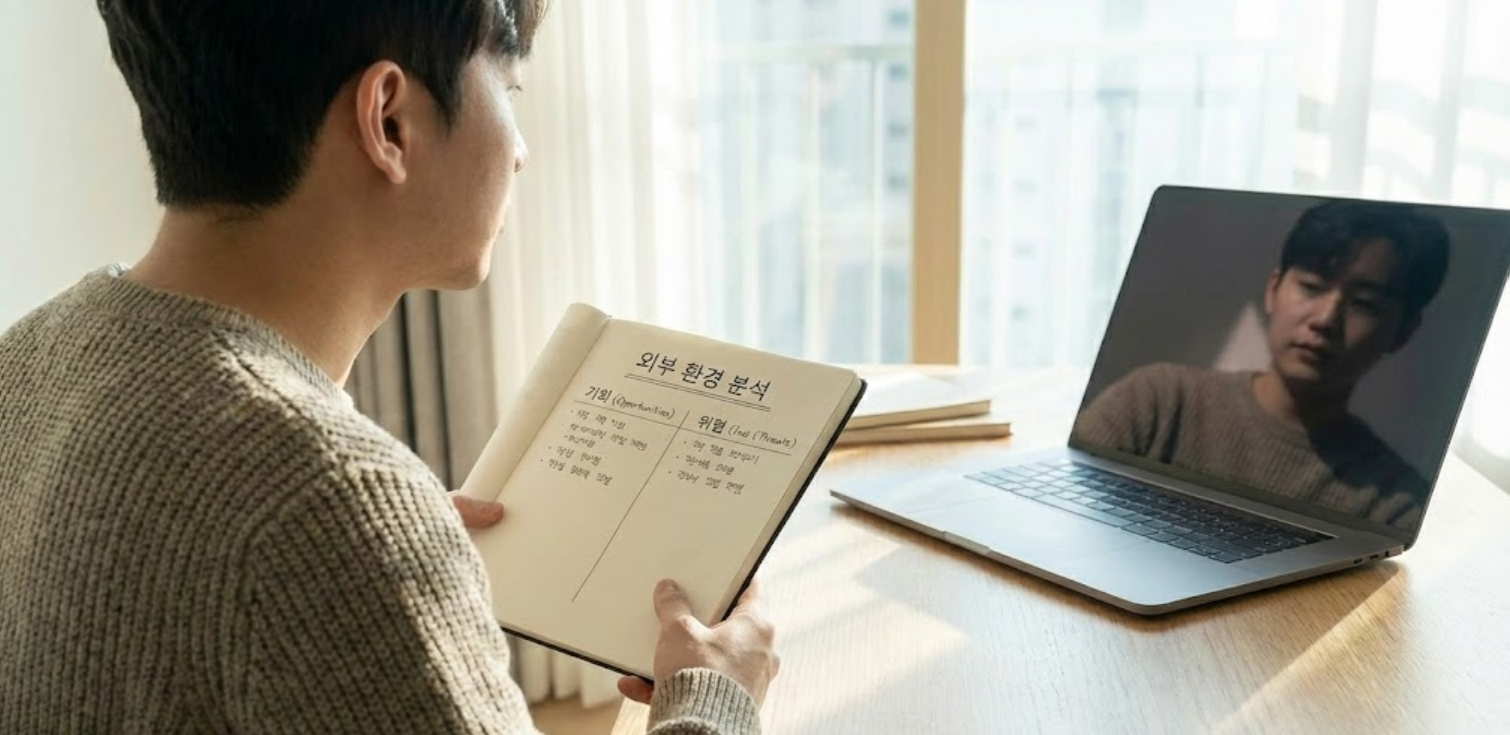 다음은 우리를 둘러싼 ‘외부’ 환경을 살펴보는 단계입니다. 기회와 위협은 우리가 직접 통제할 수 없지만, 적절히 대응함으로써 영향을 최소화하거나 최대화할 수 있는 요소들이에요.
